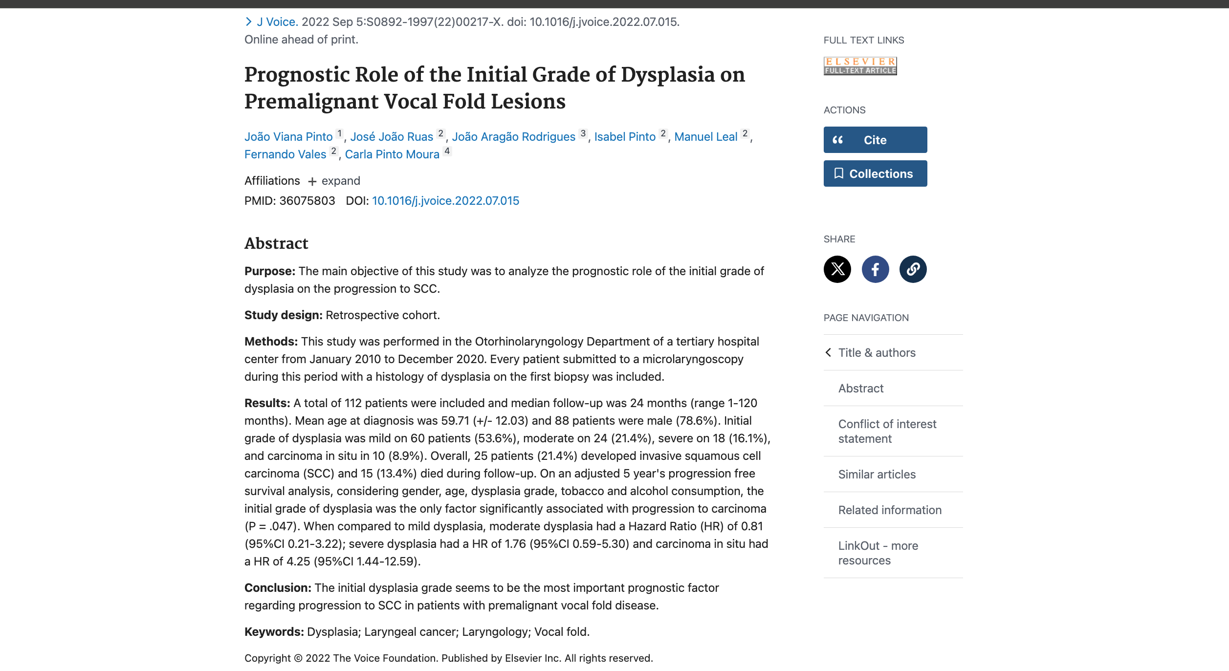 Você está em: Start > Publications > View > Prognostic Role of the Initial Grade of Dysplasia on Premalignant Vocal Fold Lesions