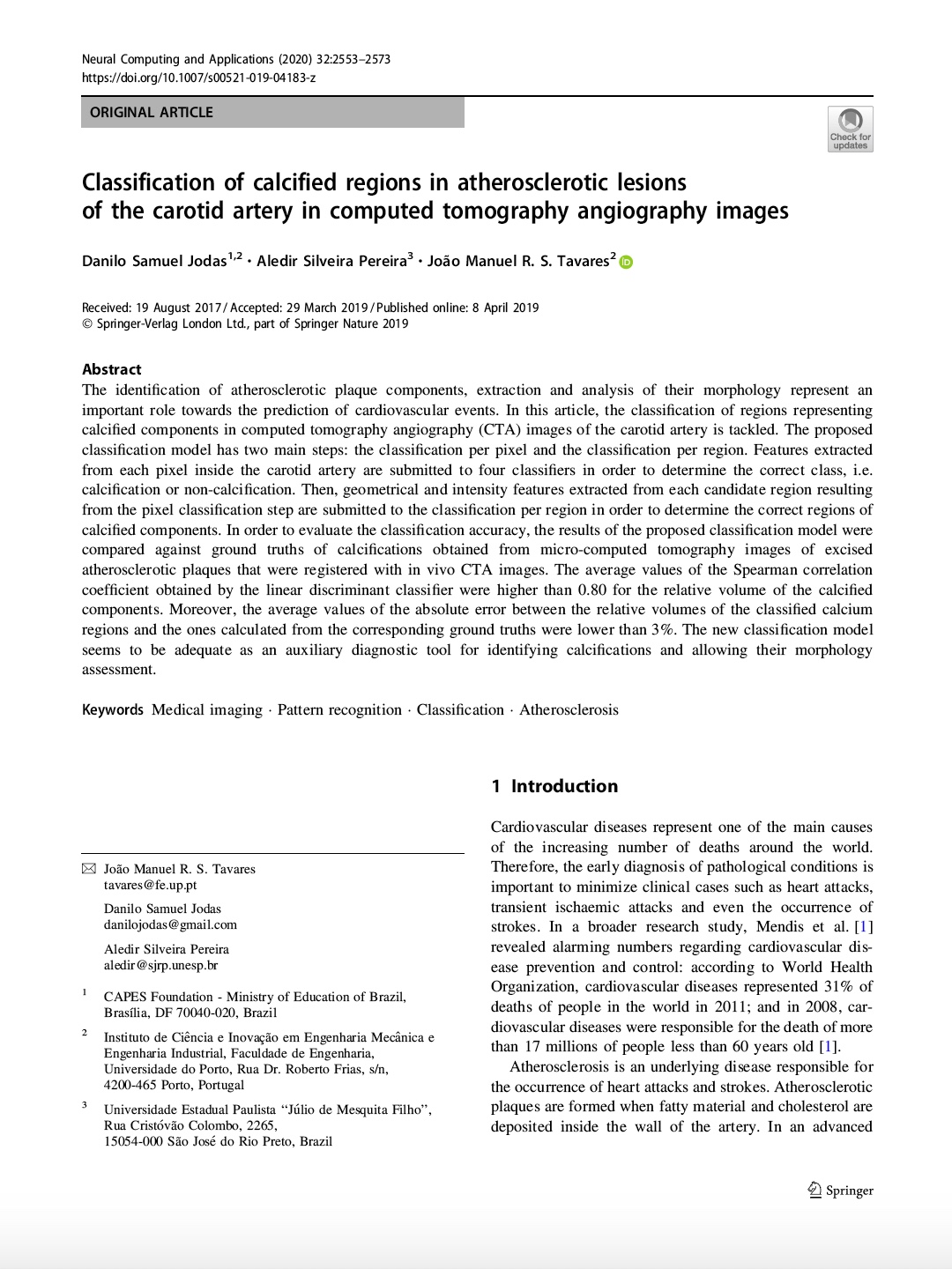 The identification of atherosclerotic plaque components, extraction and analysis of their morphology represent an important role towards the prediction of cardiovascular events. In this article, the classification of regions representing calcified components in computed tomography angiography (CTA) images of the carotid artery is tackled. The proposed classification model has two main steps: the classification per pixel and the classification per region. Features extracted from each pixel inside the carotid artery are submitted to four classifiers in order to determine the correct class, i.e. calcification or non-calcification. Then, geometrical and intensity features extracted from each candidate region resulting from the pixel classification step are submitted to the classification per region in order to determine the correct regions of calcified components. In order to evaluate the classification accuracy, the results of the proposed classification model were compared against ground truths of calcifications obtained from micro-computed tomography images of excised atherosclerotic plaques that were registered with in vivo CTA images. The average values of the Spearman correlation coefficient obtained by the linear discriminant classifier were higher than 0.80 for the relative volume of the calcified components. Moreover, the average values of the absolute error between the relative volumes of the classified calcium regions and the ones calculated from the corresponding ground truths were lower than 3%. The new classification model seems to be adequate as an auxiliary diagnostic tool for identifying calcifications and allowing their morphology assessment.