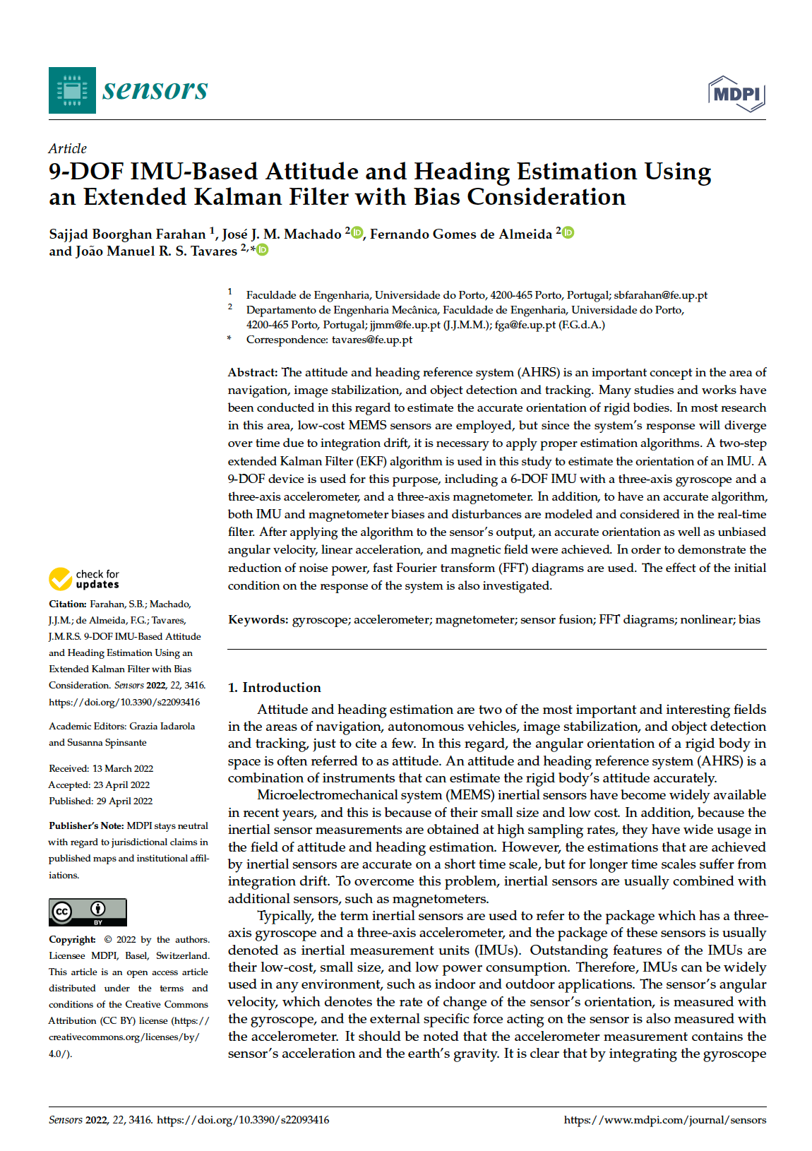 The attitude and heading reference system (AHRS) is an important concept in the area of navigation, image stabilization, and object detection and tracking. Many studies and works have been conducted in this regard to estimate the accurate orientation of rigid bodies. In most research in this area, low-cost MEMS sensors are employed, but since the system's response will diverge over time due to integration drift, it is necessary to apply proper estimation algorithms. A two-step extended Kalman Filter (EKF) algorithm is used in this study to estimate the orientation of an IMU. A 9-DOF device is used for this purpose, including a 6-DOF IMU with a three-axis gyroscope and a three-axis accelerometer, and a three-axis magnetometer. In addition, to have an accurate algorithm, both IMU and magnetometer biases and disturbances are modeled and considered in the real-time filter. After applying the algorithm to the sensor's output, an accurate orientation as well as unbiased angular velocity, linear acceleration, and magnetic field were achieved. In order to demonstrate the reduction of noise power, fast Fourier transform (FFT) diagrams are used. The effect of the initial condition on the response of the system is also investigated.