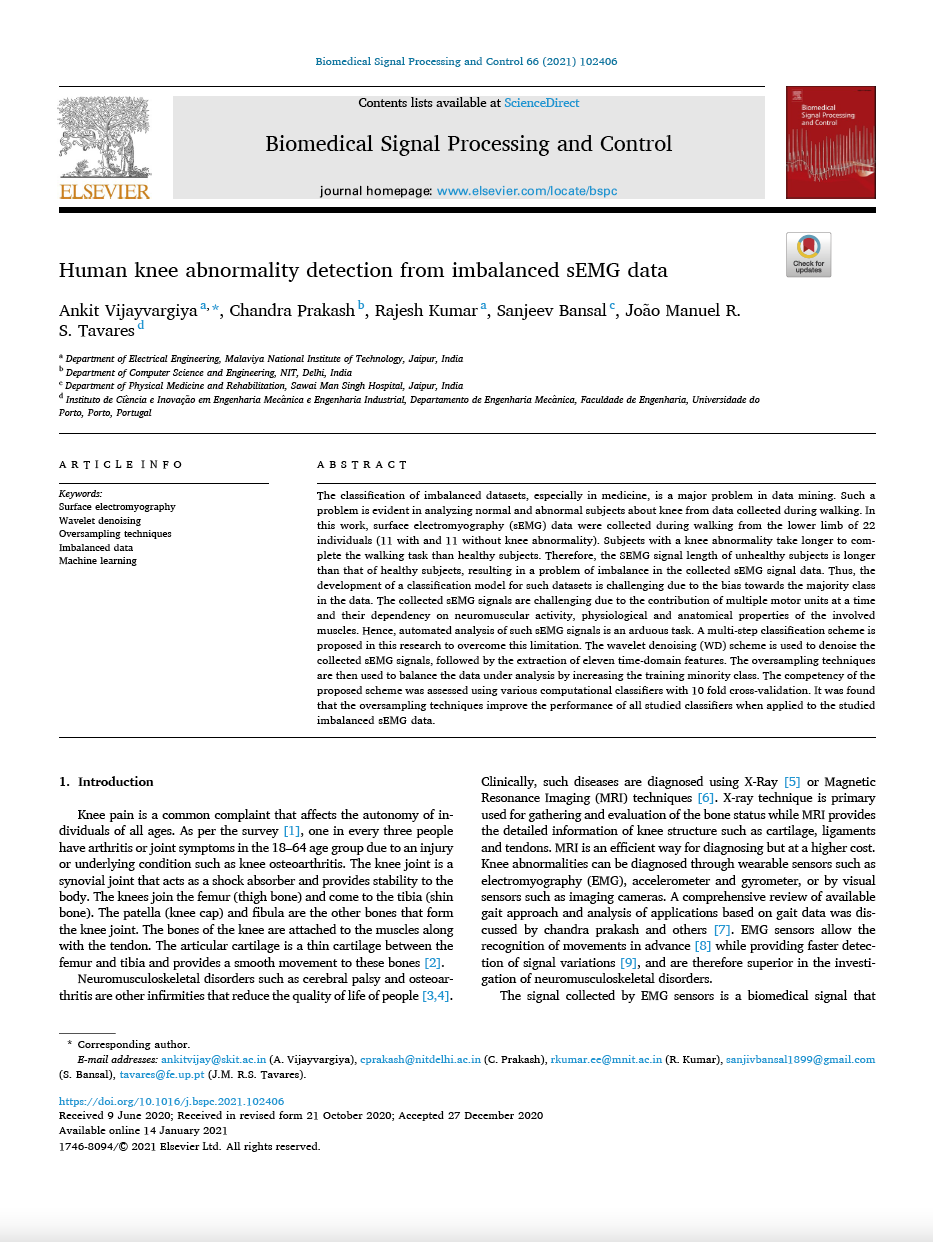The classification of imbalanced datasets, especially in medicine, is a major problem in data mining. Such a problem is evident in analyzing normal and abnormal subjects about knee from data collected during walking. In this work, surface electromyography (sEMG) data were collected during walking from the lower limb of 22 individuals (11 with and 11 without knee abnormality). Subjects with a knee abnormality take longer to complete the walking task than healthy subjects. Therefore, the SEMG signal length of unhealthy subjects is longer than that of healthy subjects, resulting in a problem of imbalance in the collected sEMG signal data. Thus, the development of a classification model for such datasets is challenging due to the bias towards the majority class in the data. The collected sEMG signals are challenging due to the contribution of multiple motor units at a time and their dependency on neuromuscular activity, physiological and anatomical properties of the involved muscles. Hence, automated analysis of such sEMG signals is an arduous task. A multi-step classification scheme is proposed in this research to overcome this limitation. The wavelet denoising (WD) scheme is used to denoise the collected sEMG signals, followed by the extraction of eleven time-domain features. The oversampling techniques are then used to balance the data under analysis by increasing the training minority class. The competency of the proposed scheme was assessed using various computational classifiers with 10 fold cross-validation. It was found that the oversampling techniques improve the performance of all studied classifiers when applied to the studied imbalanced sEMG data.