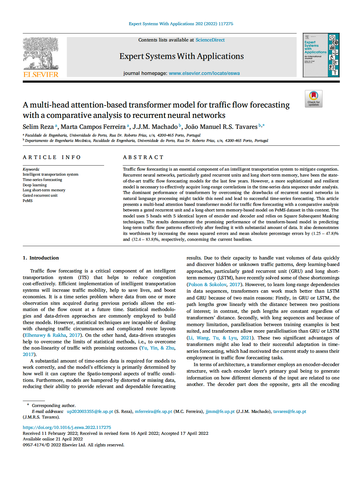 Abstract (EN): Traffic flow forecasting is an essential component of an intelligent transportation system to mitigate congestion. Recurrent neural networks, particularly gated recurrent units and long short-term memory, have been the stateof-the-art traffic flow forecasting models for the last few years. However, a more sophisticated and resilient model is necessary to effectively acquire long-range correlations in the time-series data sequence under analysis. The dominant performance of transformers by overcoming the drawbacks of recurrent neural networks in natural language processing might tackle this need and lead to successful time-series forecasting. This article presents a multi-head attention based transformer model for traffic flow forecasting with a comparative analysis between a gated recurrent unit and a long-short term memory-based model on PeMS dataset in this context. The model uses 5 heads with 5 identical layers of encoder and decoder and relies on Square Subsequent Masking techniques. The results demonstrate the promising performance of the transform-based model in predicting long-term traffic flow patterns effectively after feeding it with substantial amount of data. It also demonstrates its worthiness by increasing the mean squared errors and mean absolute percentage errors by (1.25 - 47.8)% and (32.4 - 83.8)%, respectively, concerning the current baselines.