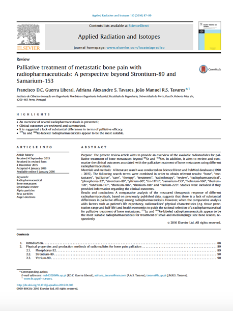A comparative analysis of the measured therapeutic response of different radiopharmaceuticals, based on previously published data, suggests that there is a lack of substantial differences in palliative efficacy among radiopharmaceuticals. However, when the comparative analysis adds factors such as patient¿s life expectancy, radionuclides¿ physical characteristics (e.g. tissue penetration range and half-life) and health economics to guide the rational selection of a radiopharmaceutical for palliative treatment of bone metastases, 177Lu and 188Re-labeled radiopharmaceuticals appear to be the most suitable radiopharmaceuticals for treatment of small and medium/large size bone lesions, respectively.