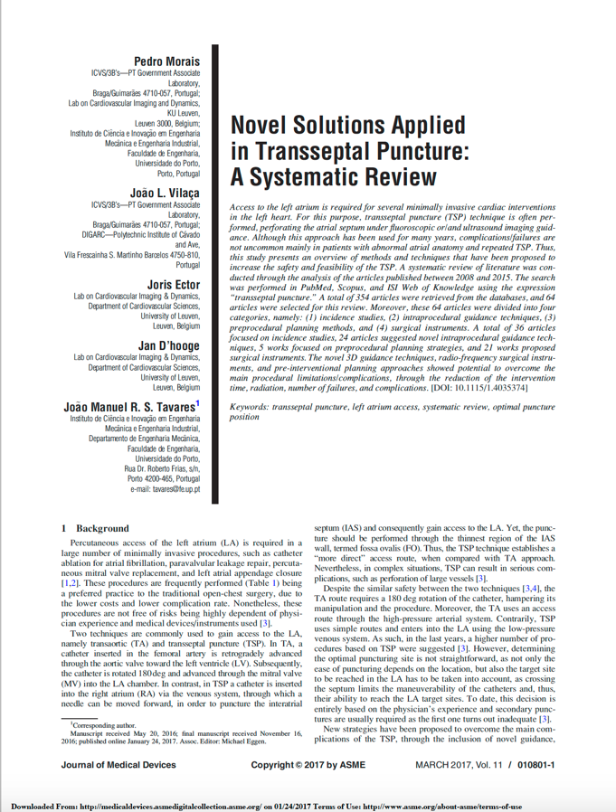 Access to the left atrium is required for several minimally invasive cardiac interventions in the left heart. For this purpose, transseptal puncture (TSP) technique is often performed, perforating the atrial septum under fluoroscopic or/and ultrasound imaging guidance. Although this approach has been used for many years, complications/failures are not uncommon mainly in patients with abnormal atrial anatomy and repeated TSP. Thus, this study presents an overview of methods and techniques that have been proposed to increase the safety and feasibility of the TSP. A systematic review of literature was conducted through the analysis of the articles published between 2008 and 2015. The search was performed in PubMed, Scopus, and ISI Web of Knowledge using the expression "transseptal puncture." A total of 354 articles were retrieved from the databases, and 64 articles were selected for this review. Moreover, these 64 articles were divided into four categories, namely: (1) incidence studies, (2) intraprocedural guidance techniques, (3) preprocedural planning methods, and (4) surgical instruments. A total of 36 articles focused on incidence studies, 24 articles suggested novel intraprocedural guidance techniques, 5 works focused on preprocedural planning strategies, and 21 works proposed surgical instruments. The novel 3D guidance techniques, radio-frequency surgical instruments, and pre-interventional planning approaches showed potential to overcome the main procedural limitations/complications, through the reduction of the intervention time, radiation, number of failures, and complications.